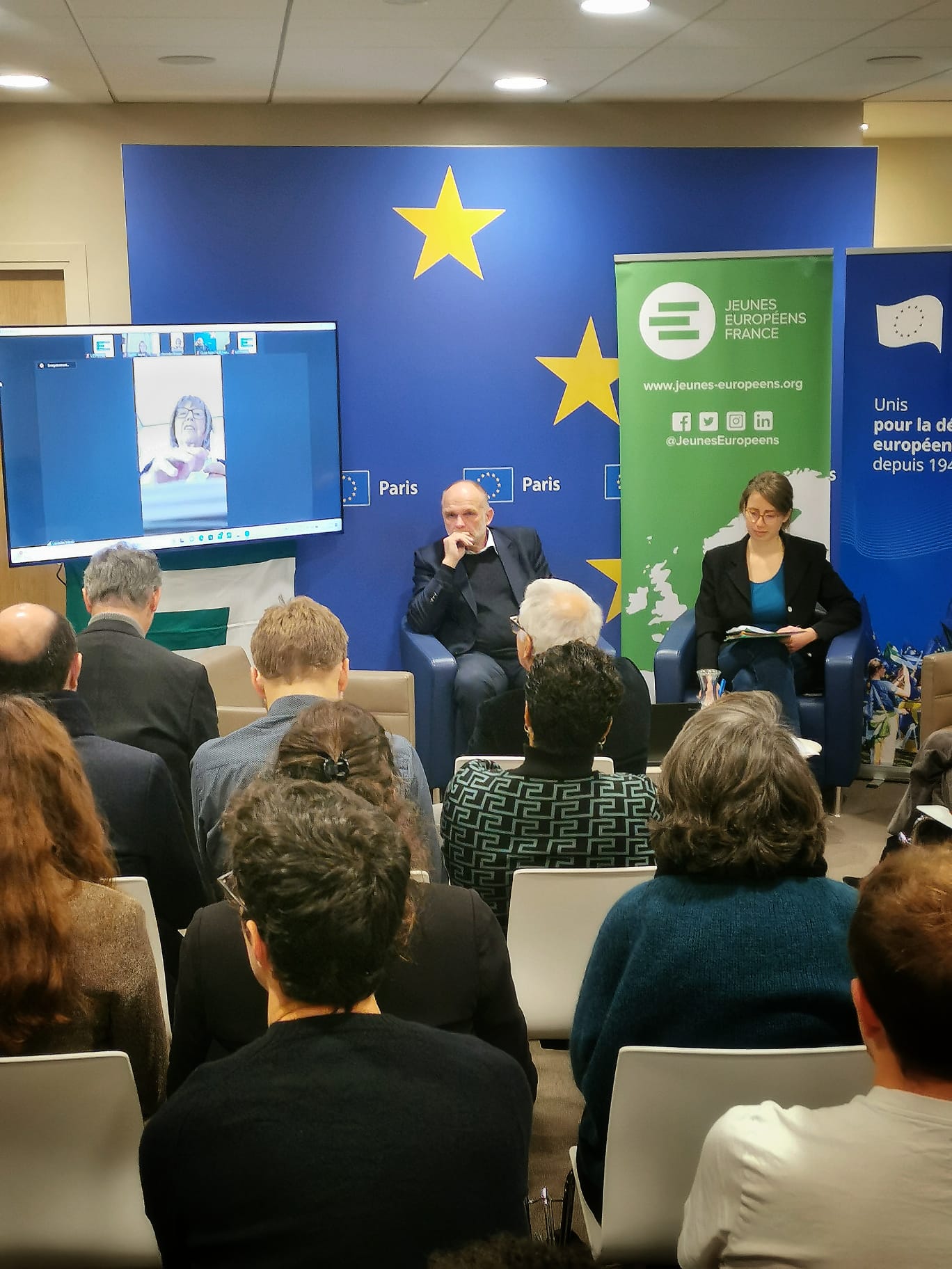 Le 2 décembre 2023, l’Union des fédéralistes européens (Europe et France), les Jeunes Européens et le Mouvement européen ont accueilli un Dialogue européen à Europa Experience à Paris axé sur les élections européennes 2024 et la manière de répondre aux attentes des citoyens. Après un accueil assuré par Sandrine Amiel de la représentation du Parlement européen en France, les présidentes et porte-parole des associations Chloé Fabre, Marie Trelat, Laure Niclot ont introduit les échanges qui ont été modérés par Aurore Laloux, présidente de Jeunes européens Paris.